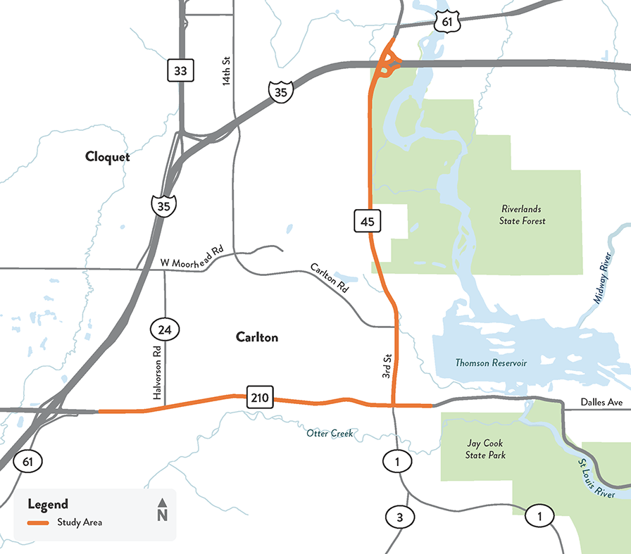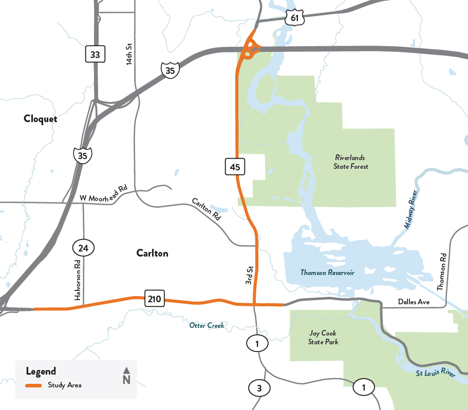 MnDOT, in partnership with local project partners and stakeholders, is studying the Highway 45 and Highway 210 corridors in preparation for two resurfacing projects tentatively planned for 2035. The study area includes Highway 45 from I-35 south to Carlton and Highway 210 from just east of County Road 61 to Sixth Street North in Carlton.