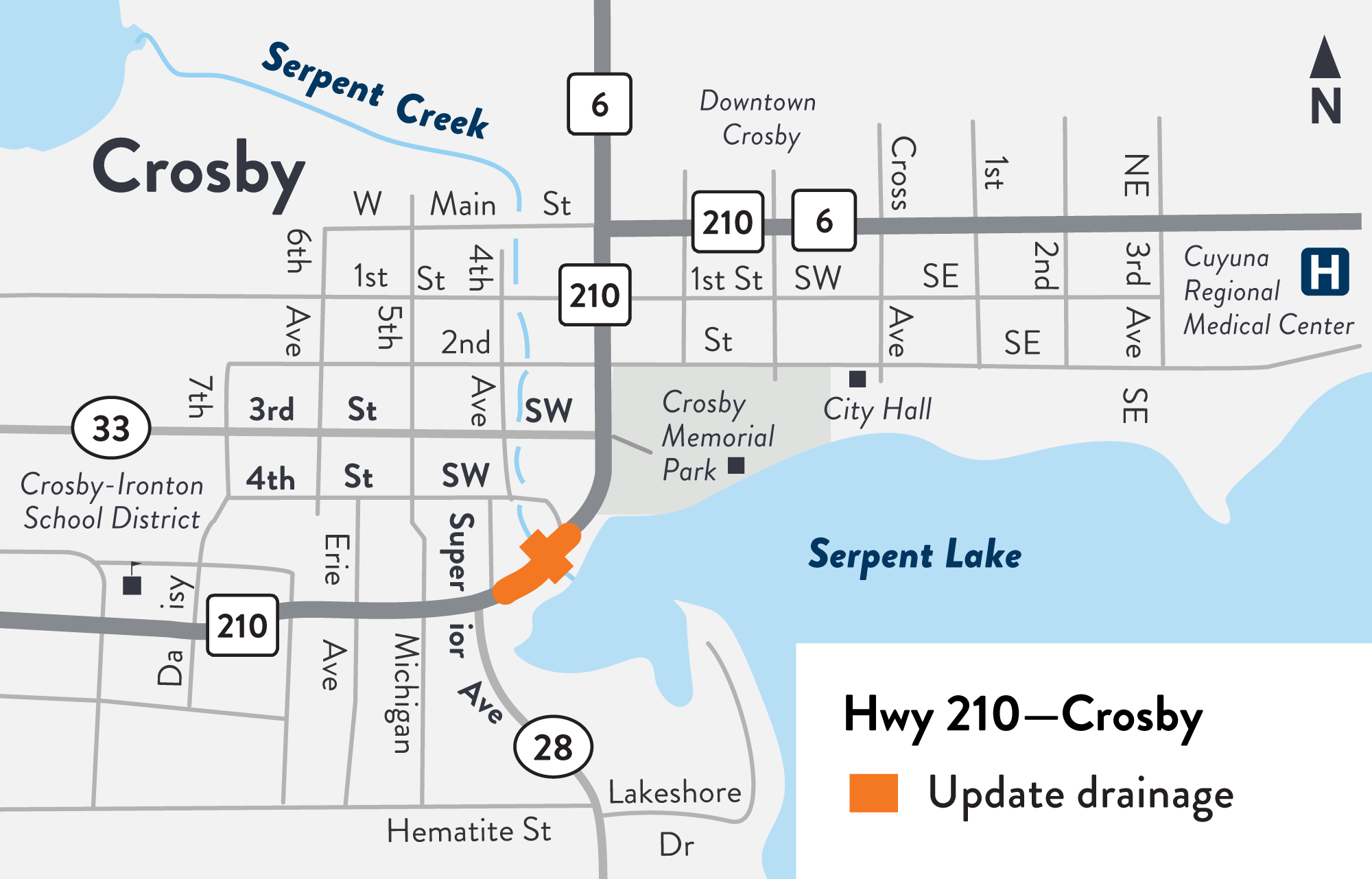 MnDOT will replace and update the 1943 Serpent Creek drainage structure beneath Hwy 210 which includes the water level control for Serpent Lake in Crosby. Project requires a detour.