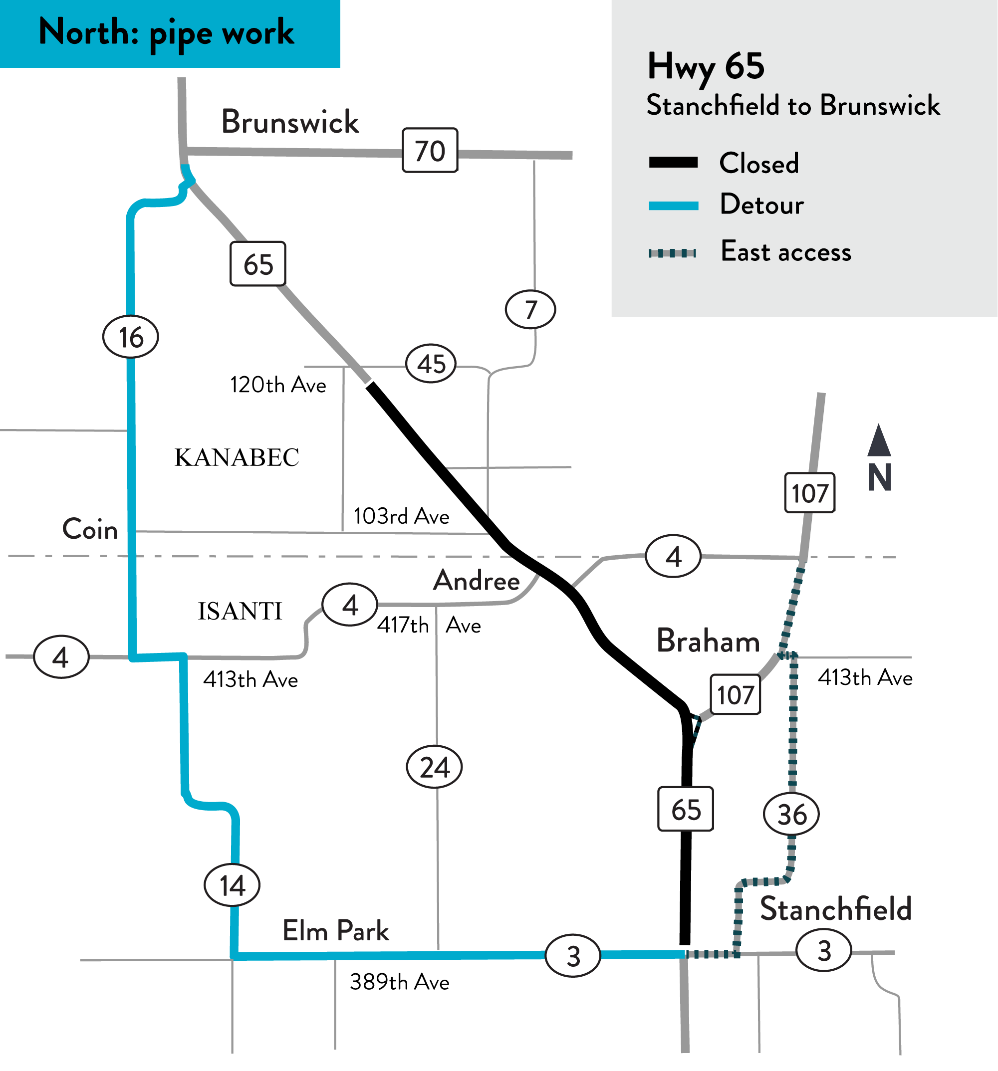 Crews will work on two segments of Hwy 65—north or south of Isanti Co. Rd. 3 near Stanchfield. Motorists can expect lane or road closures with detours, no shoulders and one-way traffic, at times.