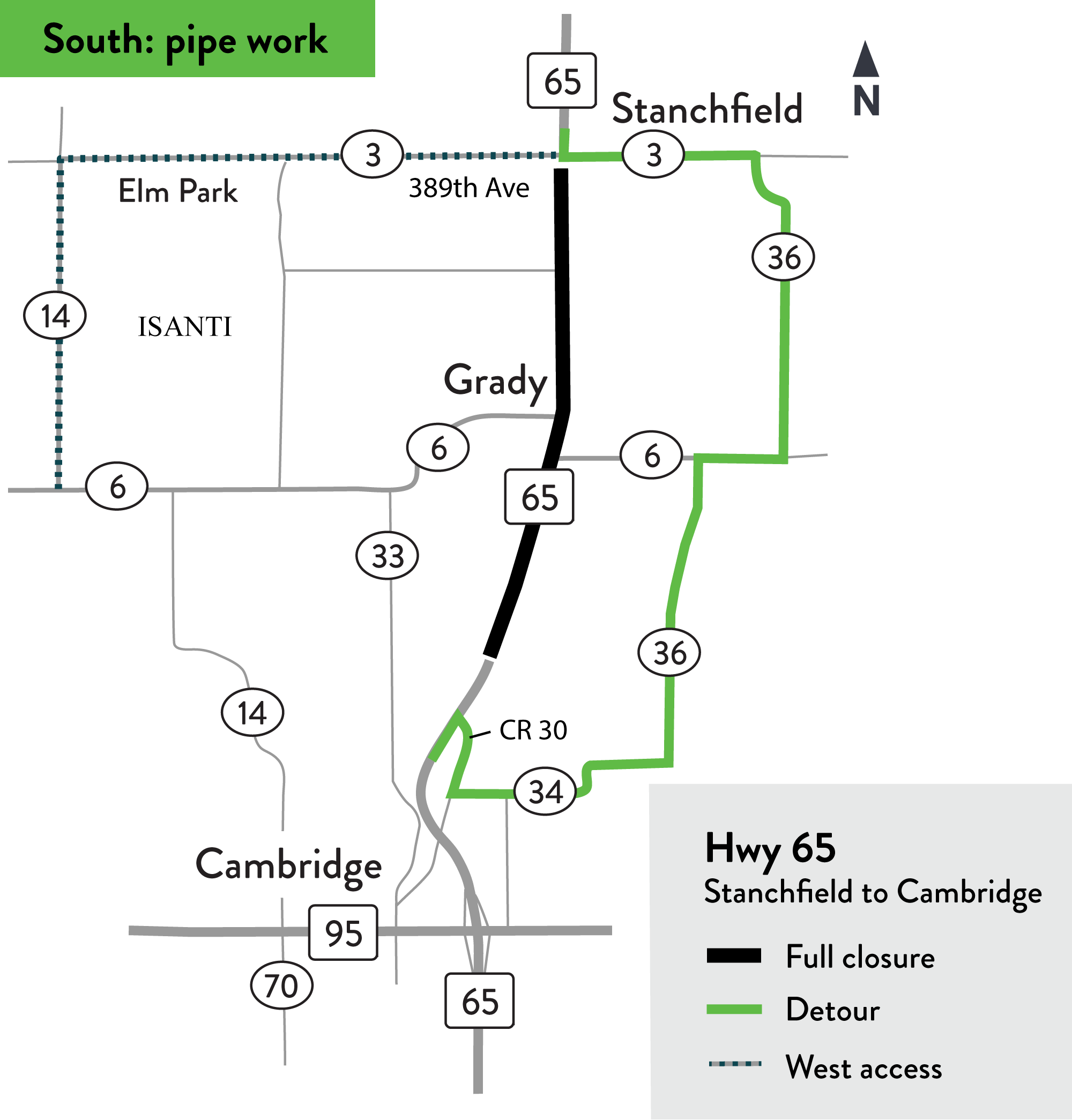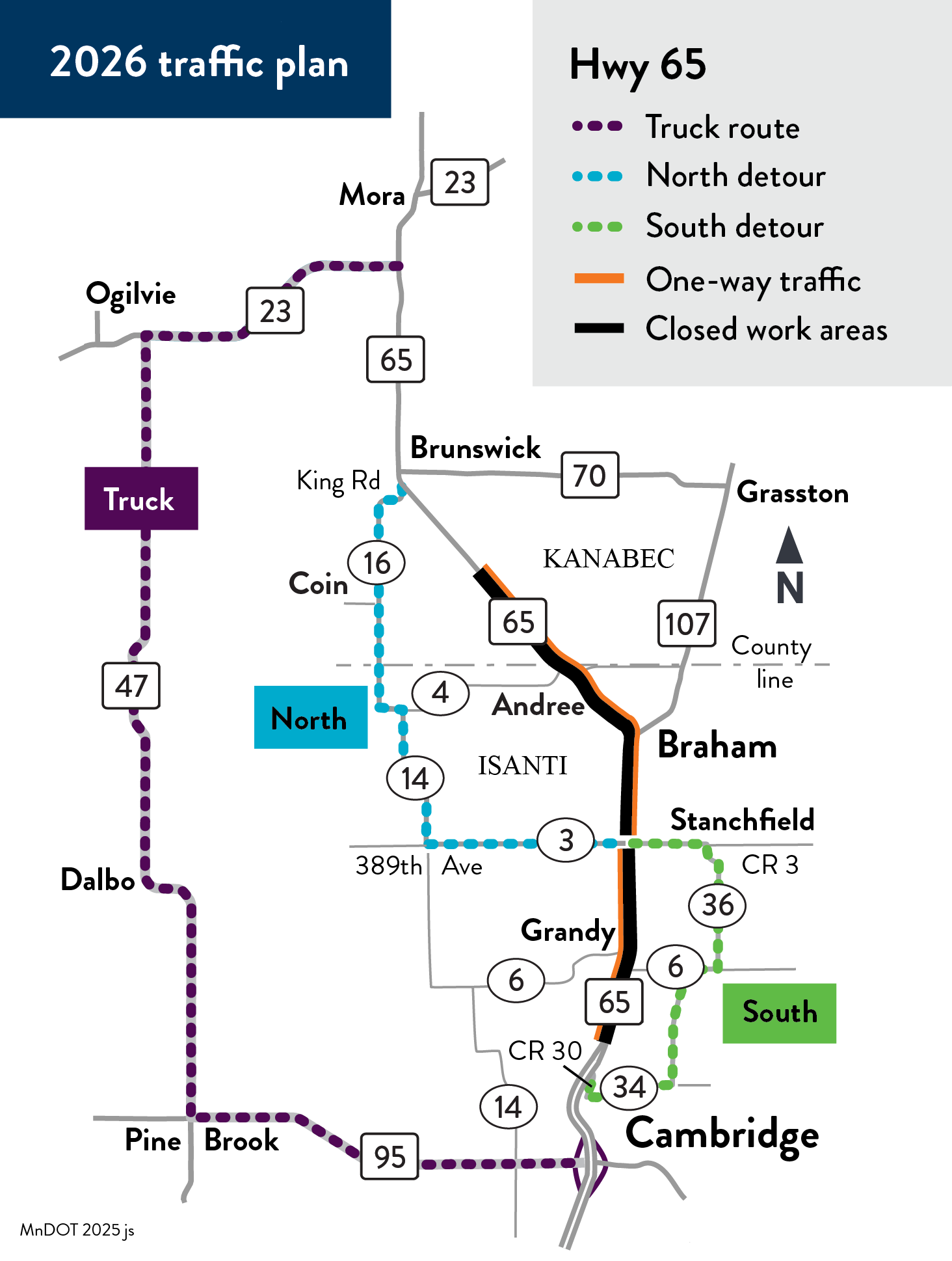 Resurface and update over 10 miles of Hwy 65 from south of 357th Ave. NE at the end of four-lane in Cambridge to south of Kanabec Co. Rd. 45/120th Ave. north of Braham, includes drainage and sidewalks in Grandy. 2026 traffic plans: work will be done in segments and require detours.