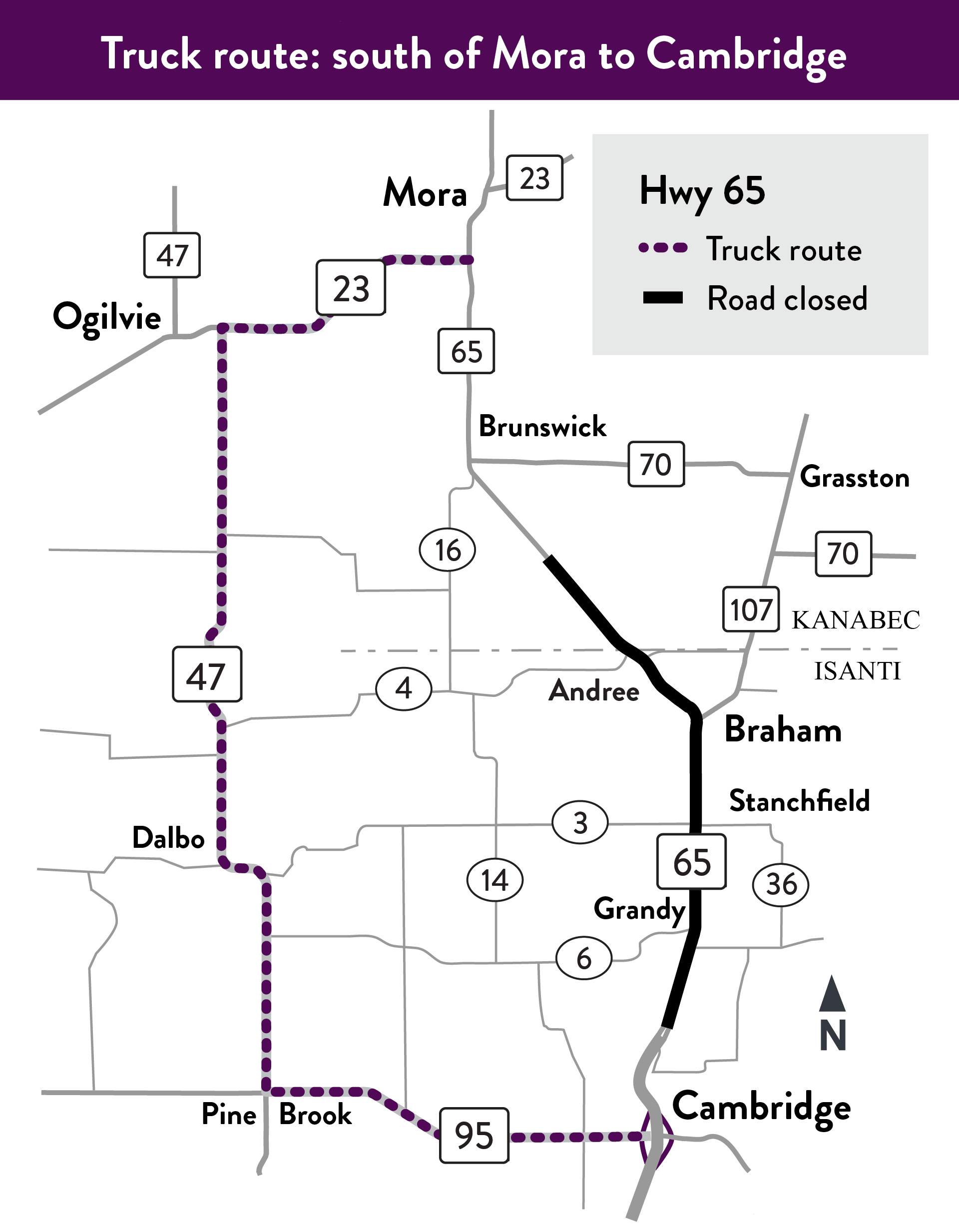 Truck route (PNG) via Hwy 23 south of Mora to Hwy 47 Ogilvie to Hwy 95 Pine Brook to Cambridge or seek other route to avoid delays