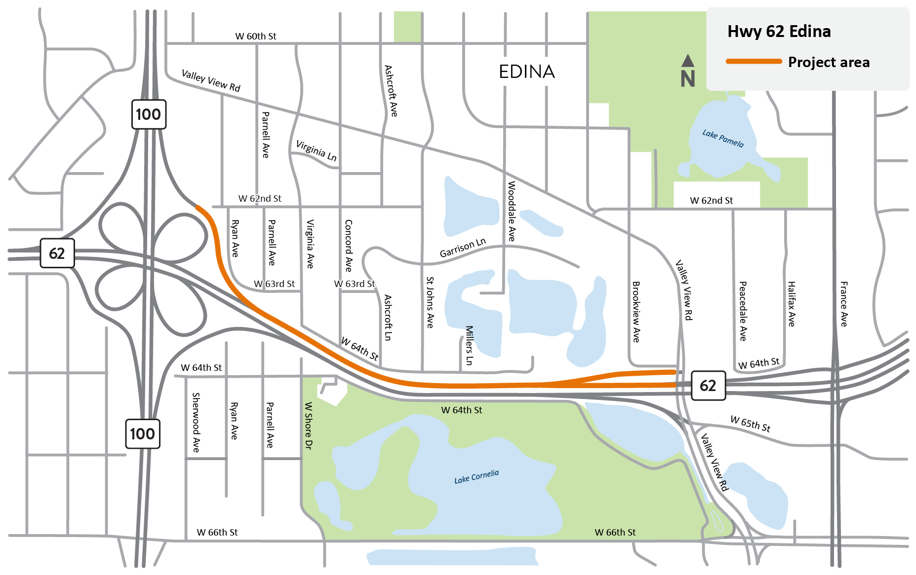 Westbound Highway 62 between Valley Creek Road and the ramp to northbound Highway 100 in Edina project location map