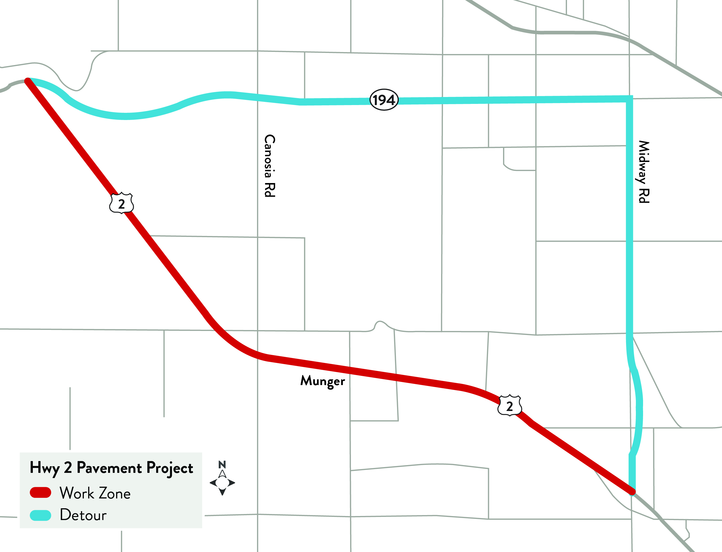 About this project Resurfacing improvements on Hwy 2 Traffic signal maintenance at Midway Road Several new turn lanes Work zone map. Click to enlarge.