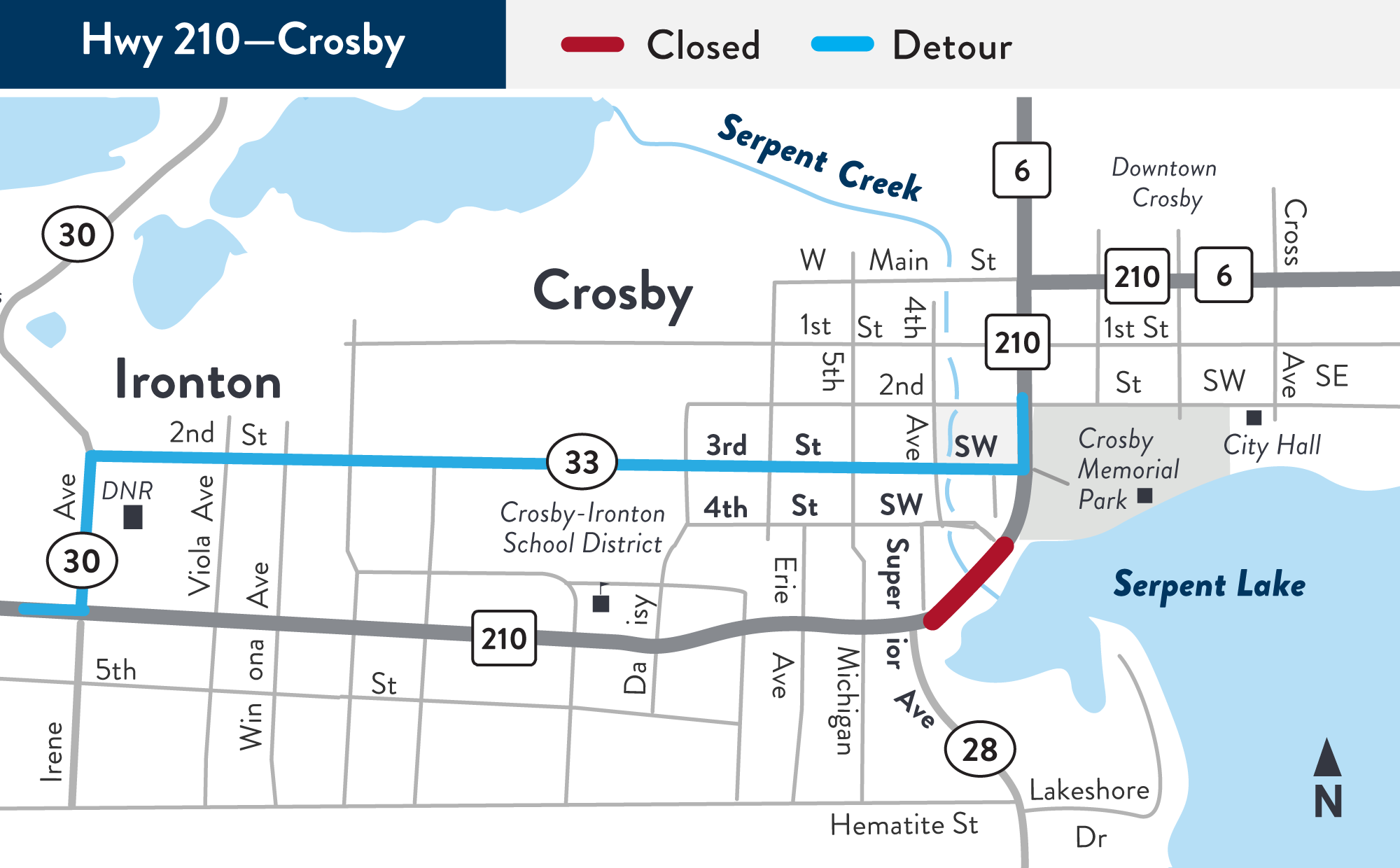 MnDOT will replace and update the 1943 Serpent Creek drainage structure beneath Hwy 210 which includes the water level control for Serpent Lake in Crosby. Project requires a detour.
