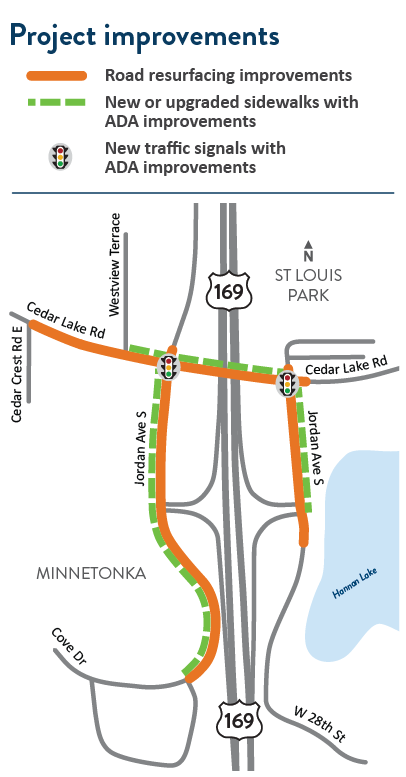 Information about upcoming traffic impacts will be provided as details become available. Motorists can expect intermittent lane closures and lane shifts on Cedar Lake Rd. throughout the project. Jordan Ave. South in Minnetonka will be reduced to one lane between Cove Dr. and just south of the Hwy 169 ramps with a temporary signal to direct traffic. Jordan Ave. South will be closed between Cedar Lake Rd. and just north of the Hwy 169 ramps for approximately one month during construction in St. Louis Park and in Minnetonka. These closures will not occur at the same time.