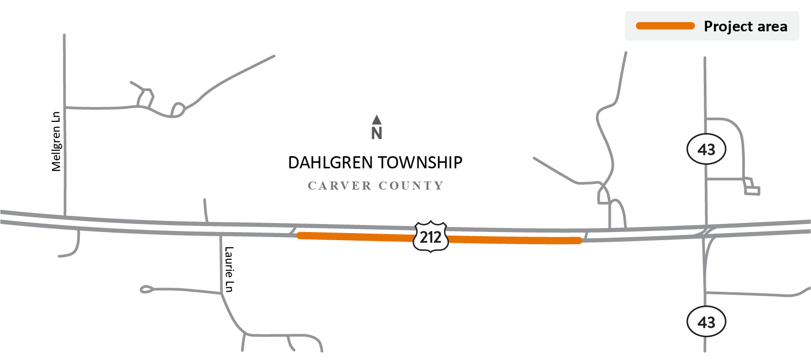 Information about upcoming traffic impacts will be provided as details become available. Hwy 212 will be reduced to one lane in both directions with head-to-head traffic between Laurie Ln. and Co. Rd. 43.