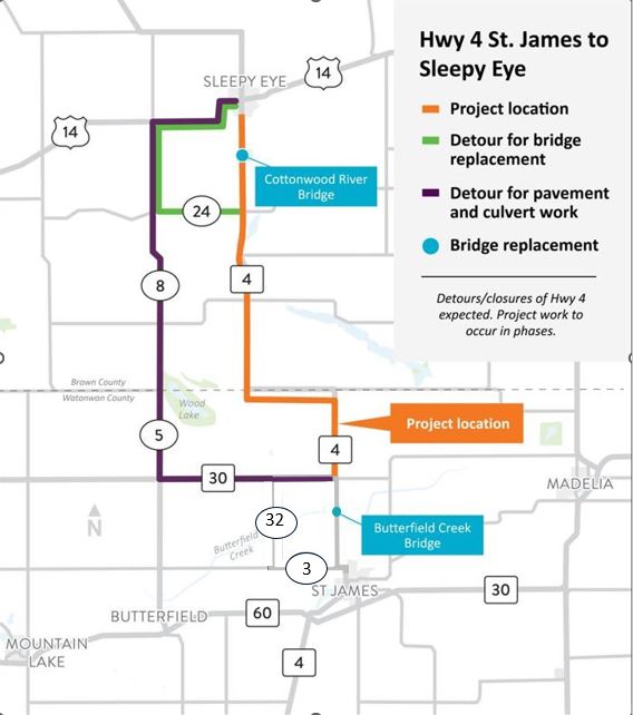 The Hwy 4 project between St. James and Sleepy Eye includes roadway, bridge, and drainage improvements. In addition to resurfacing approximately 25 miles of roadway, three bridges will be replaced.