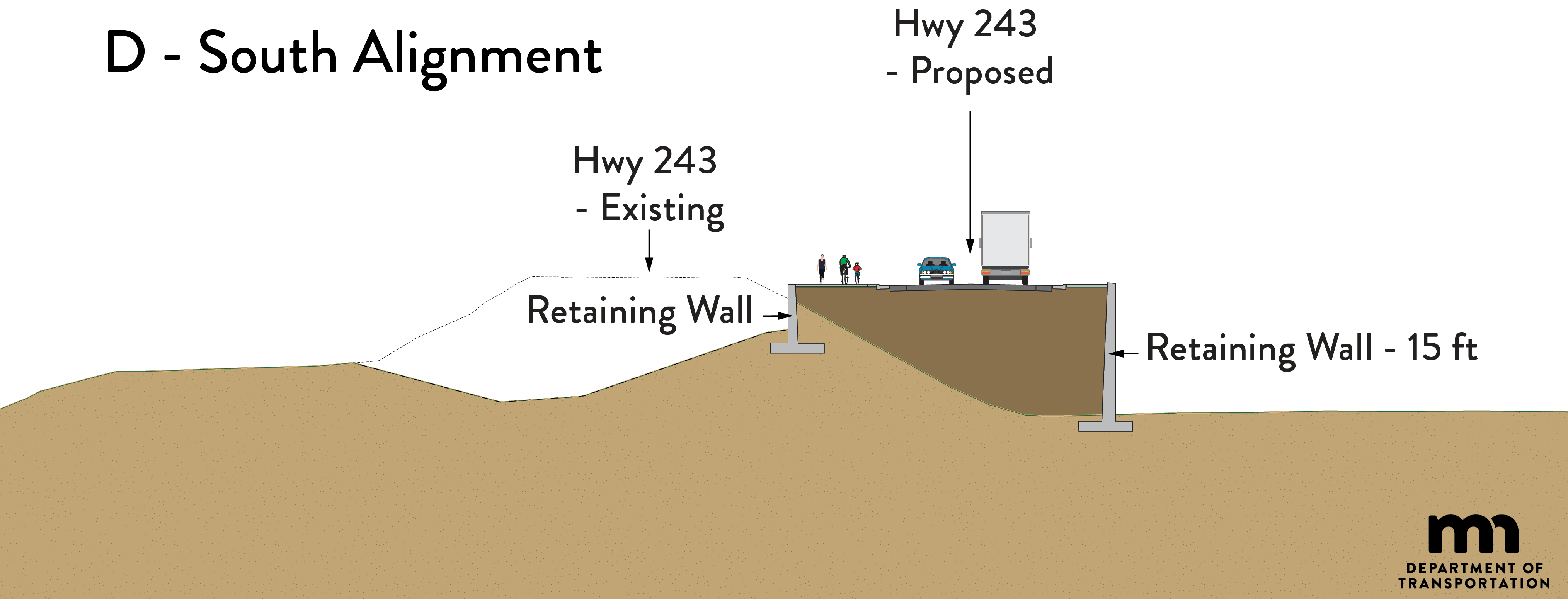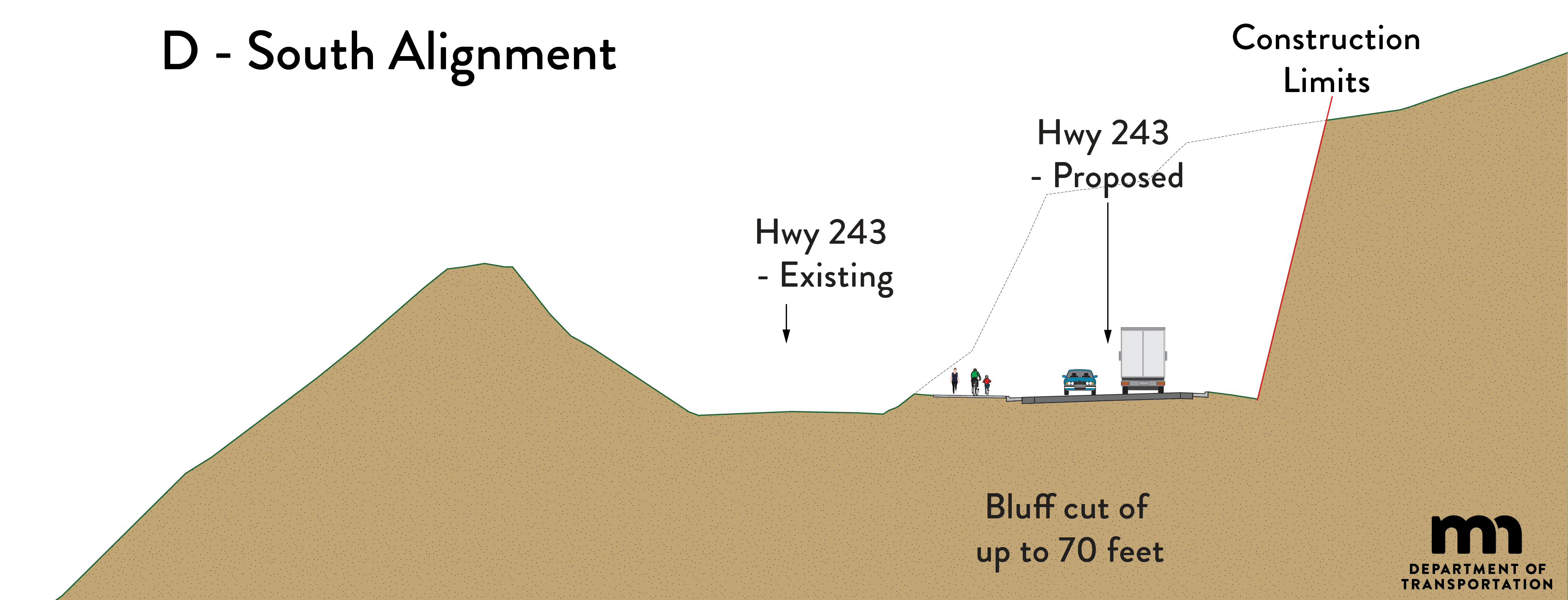 Build Concept D: Concept D includes constructing a new bridge crossing parallel to the existing Hwy 243 bridge. The new bridge would be built to the south of the existing bridge. The existing Hwy 243 Bridge would be removed following construction of the new bridge.